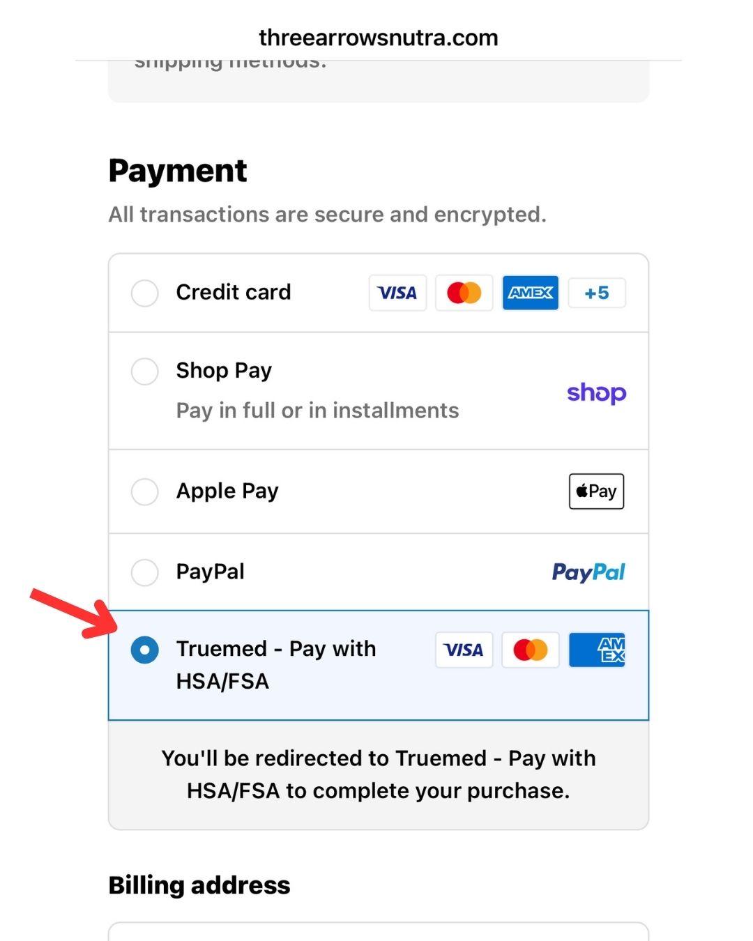 You should be able to scroll down now and under "Payment" select “TrueMed - Pay with HSA/FSA”